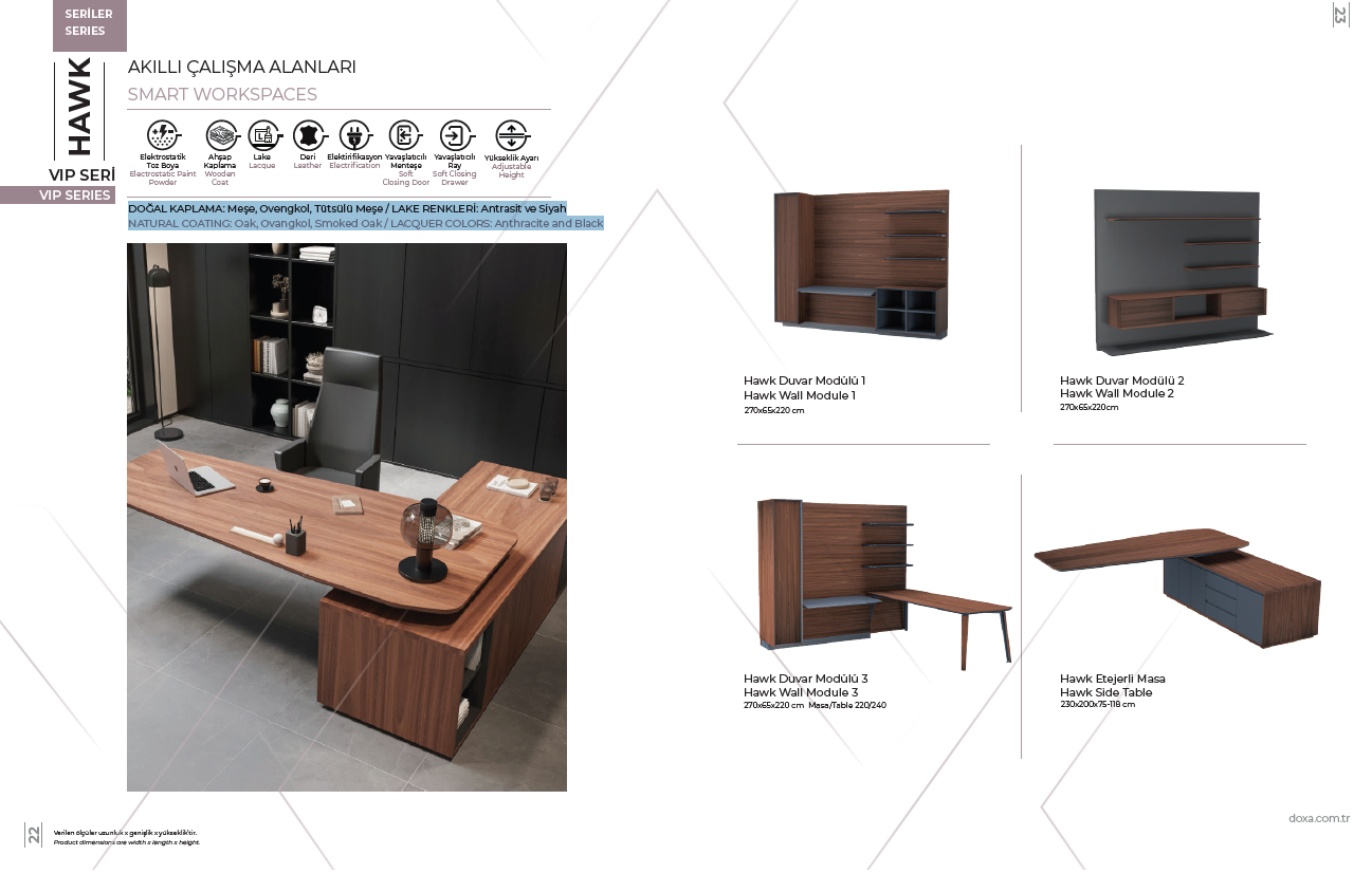 DOĞAL KAPLAMA: Meşe, Ovengkol, Tütsülü Meşe / LAKE RENKLERİ: Antrasit ve Siyah