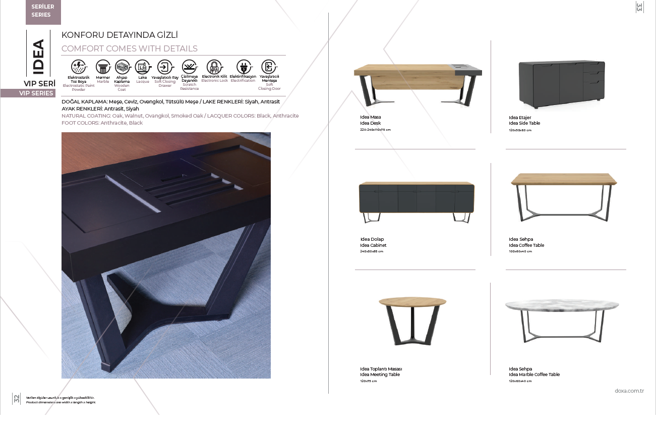 DOĞAL KAPLAMA: Meşe, Ceviz, Ovengkol, Tütsülü Meşe / LAKE RENKLERİ: Siyah, Antrasit