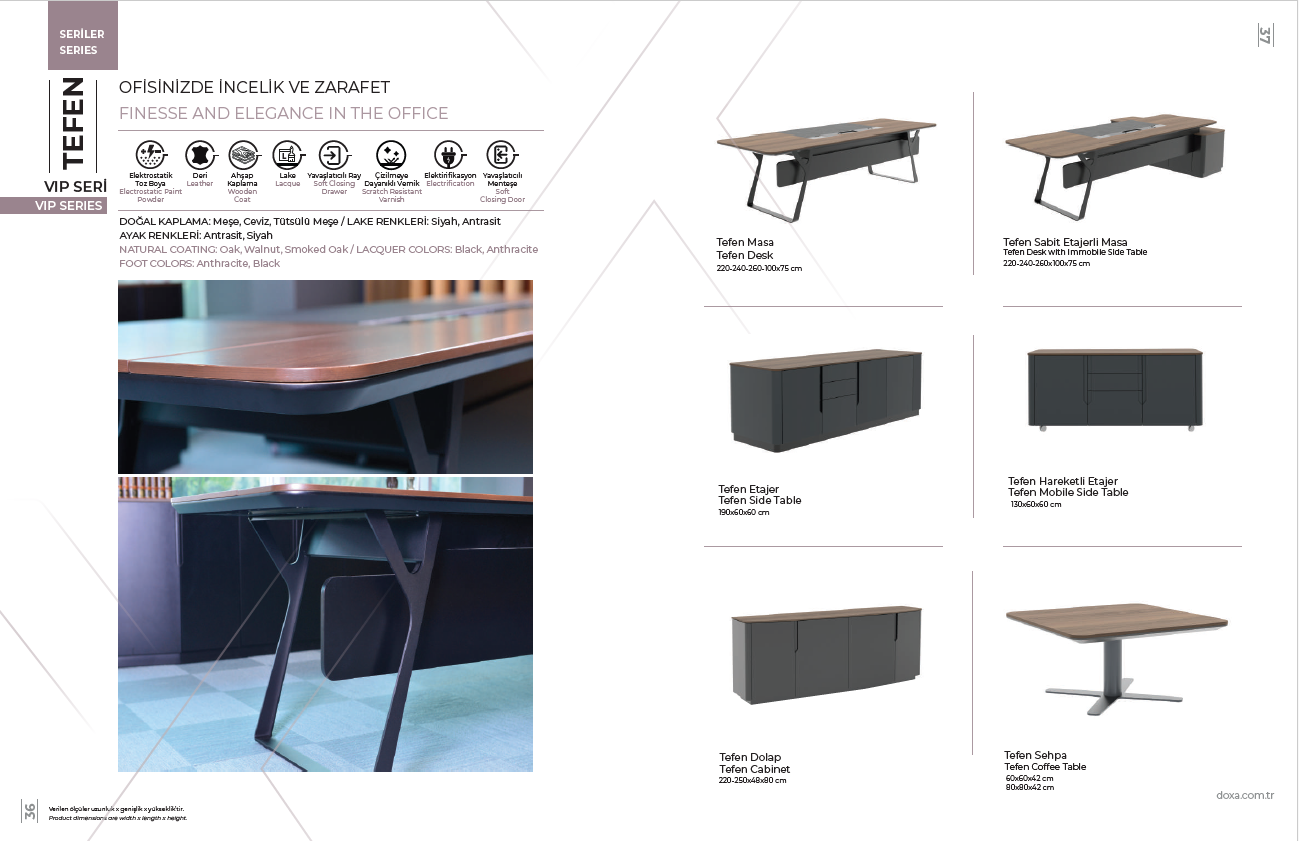DOĞAL KAPLAMA: Meşe, Ceviz, Tütsülü Meşe / LAKE RENKLERİ: Siyah, Antrasit